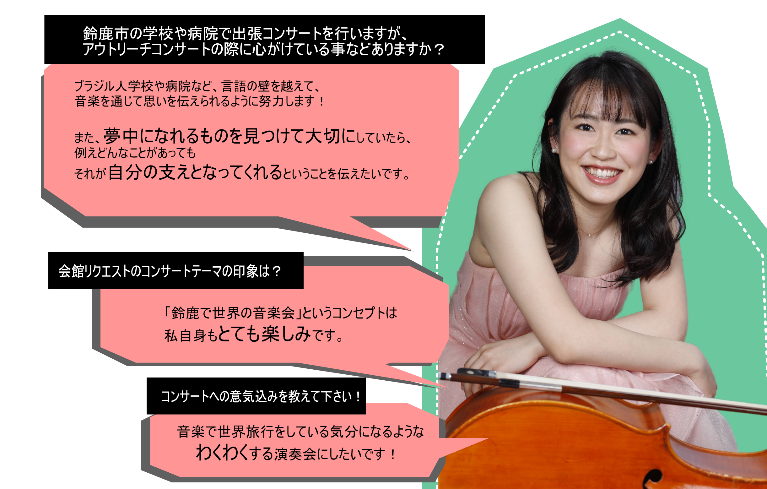 お知らせ2026.02.28 チェリスト北垣彩さんよりメッセージを頂きました! 「すずかで世界の音楽会」出演の北垣彩さんからメッセージ&会館からの一問一答にお答え頂きました♪ 3月7日(土)開催のコンサートチケットはコチラから! ※画像はクリックで大きくなります https://www.suzuka-hall.jp/wp-content/uploads/2026/02/dc948c2f22ff5969dfdbb8ca25432702.mp4 前へ 一覧へ